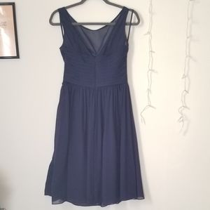 Navy Bridesmaid Dress. High Sheer neckline. V back neckline. Pleating in front and back. Small tear in skirt. Easily mended. Price reflects need for mending.