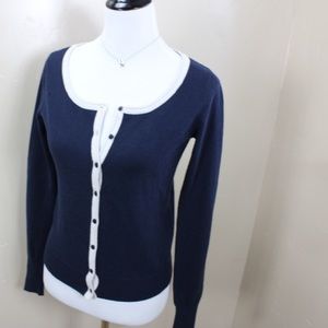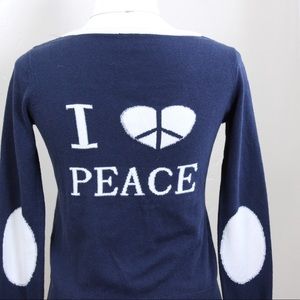 Cute little navy cardigan Sweater with white peace message on back. No size tag. Measures a small. Model is 34/28/36. The trim is outlined in metallic silver blended with white. From a French designer, Camieau. Interior has extra button attached to materials tag: viscose, polymide, cotton, 1% poly blend. Flaw- upper breast area- raised bunched area. Very small. You can feel it more than see it. Great condition otherwise showing regular wear use.20" L, 16.5" pit to pit, 24.5" uncuffed sleeves.