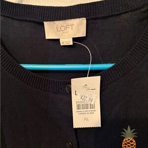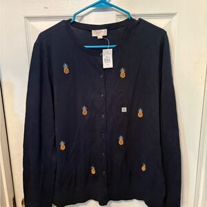 Stylish navy cardigan featuring playful pineapple embroidery. Perfect for adding a fun touch to your outfit.