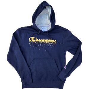Navy Champion Hoodie Center Logo Pixilated in Navy & Yellow EUC Size 2XL