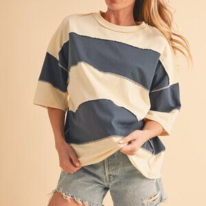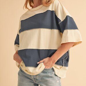 This relaxed-fit T-shirt features bold navy and cream stripes with exposed seams for a casual, effortless vibe. Its oversized silhouette and breezy style make it perfect for pairing with denim shorts or leggings.