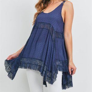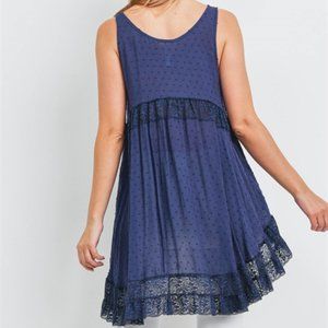 Sleeveless scoop neck lace trim detail textured flowy tunic top.