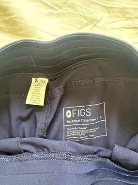 Comfortable navy scrub pants with side cargo pocket. Elastic drawstring waist for adjustable fit. Clean, solid navy color. Functional and practical for work. Small bleach stain in last photo