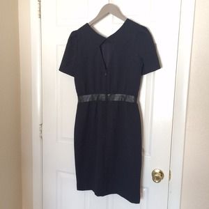 Navy blue dress with faux leather detail along waistline. The collar is pleated in the front, and the back has a keyhole cut-out at the neckline. It's a size 10 but fits like an anthropologie size 6. Worn twice.