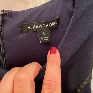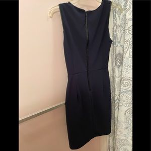 Navy dress with pleather details and back zip. Waist measures 13 inches flat but has stretch. Only worn a few times. Two very small puckers on back.