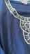 Elegant navy dress featuring a detailed beaded neckline and sleeve accents. Perfect for special occasions.