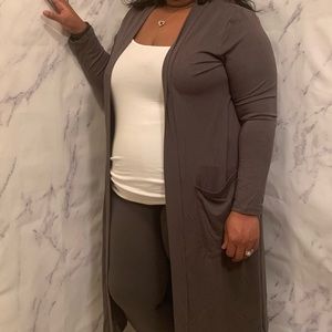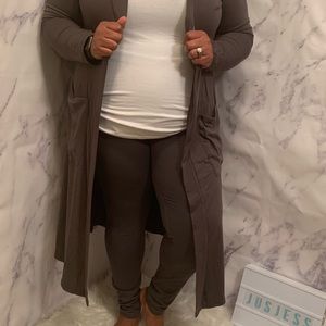 Duster Set features premium knee length slouchy pockets open cardigan with premium cotton full length leggings.
