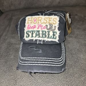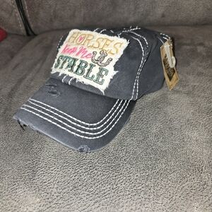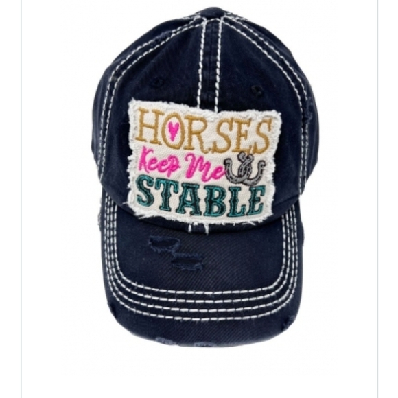 Navy cap featuring colorful embroidered text. Perfect for casual outings.