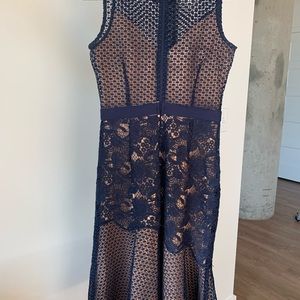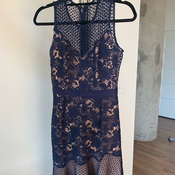 Purchased at Nordstrom Rack and worn for a wedding. Great dress, comfortable, sexy with a little peekaboo lining, and the flounce at the bottom is so fun!