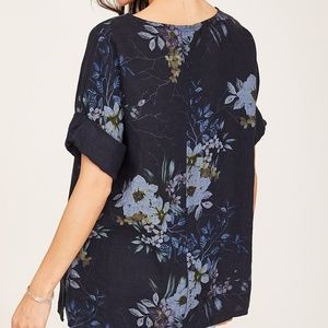 Navy Floral Linen Rolled-Sleeve Scoop Neck Top