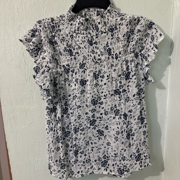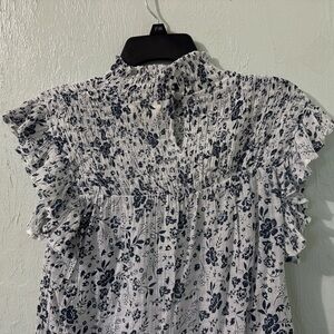 Discover elegance with this navy floral ruffle blouse. Perfect for any occasion, it adds a touch of sophistication to your wardrobe.