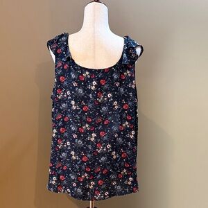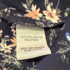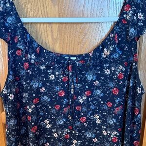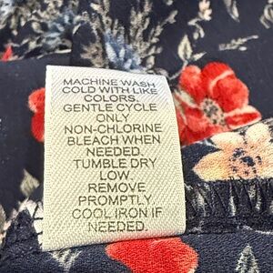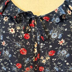 Embrace elegance with this navy floral ruffle blouse, featuring charming red and white flowers. Perfect for any occasion.