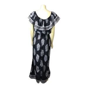 Beautiful maxi dress in navy with floral in white and taupe. Shoulder neckline can be on the shoulder or off with large ruffle. Side slits on each side