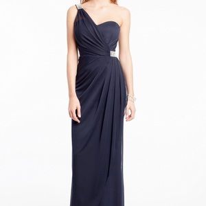 Elegant Camille La Vie dresses with ruched bodice and rhinestone accents. 4 available. In perfect condition. Worn only once. Color is dark navy. Green dress is to show back detail only.