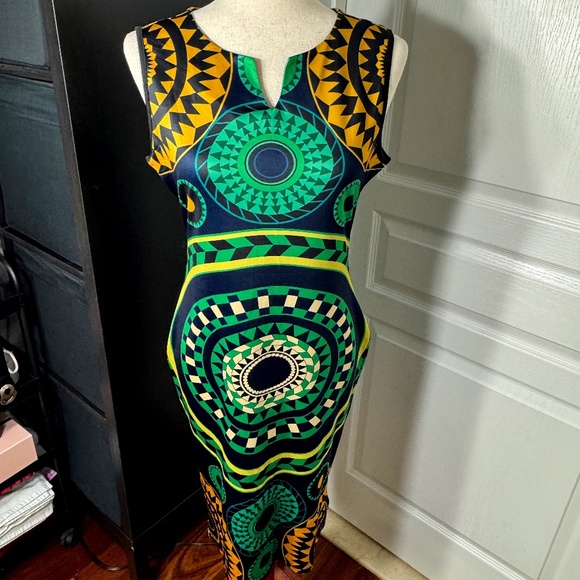 Midi slevelless stretch dress with bold pattern to get noticed in. Navy with gold, green and turquoise.