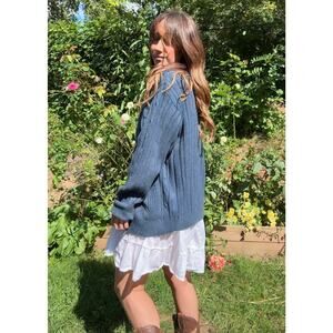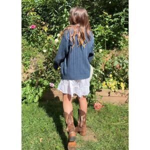 Oversized and slouchy in that effortless 90s way, this navy cable-knit grandpa cardigan is the kind of piece you end up throwing over everything. The chunky knit, leather-look buttons, and deep pockets give it that perfectly borrowed-from-dad vibe. Styled over a sundress it leans romantic, with denim it’s pure coastal cool. It slips easily into both boho Coastal Cowboy styling and fisherman-core layering, but at its core it’s just a fall staple you’ll keep reaching for.