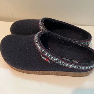 Gently worn navy Haflinger house shoes, slippers in size 42. According to the Haflinger size chart this is a size 11 in women's and size 9 in men's. No holes or stains, bottom of shoe is in excellent condition with no signs of wear.