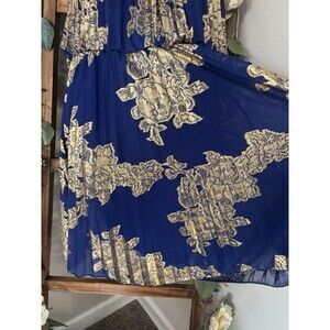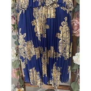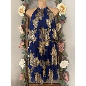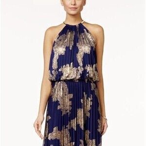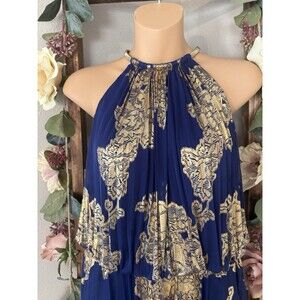 Navy Halter Neck XSCAPE Gold Foil Halter Gown Pleated Metallic-Print Pleated