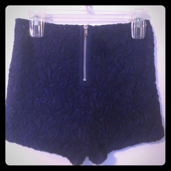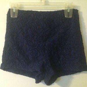 Charlotte Russe navy high waisted shorts with floral crochet lace. Back zipper. Stretchy material, tighter fit. Worn once and in excellent condition! Size M.