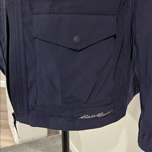 Stylish Eddie Bauer Travex navy hooded windbreaker with front pockets.