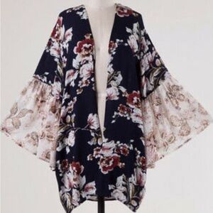 Navy & Ivory Floral Bell Sleeve Kimono Lightweight Coverup NEW