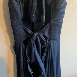 Two ties in the back, keyhole bodice. High low hem, gorgeous and flattering dress.