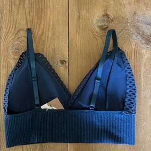 This navy lace bra combines elegance and comfort with its intricate floral lace overlay and supportive wide elastic band. The triangle plunge style and adjustable straps ensure a perfect fit, making it ideal for everyday wear.