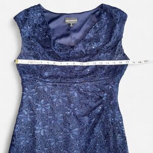 Navy blue floral lace sheath dress with cowl neckline and sequins in size 10 PETITE. Has a built in slip layer below the lace. Has a little stretch to be form fitting and flattering!