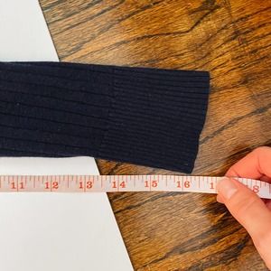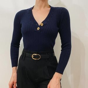 Features a navy blue color, v neck, gold button details, and ribbed material.