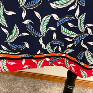 Stylish navy dress featuring a vibrant leaf print. Red accents add a pop of color.