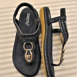 Navy Blue leather sandals with elastic in ankle for easy slide in. Decorative beads on ankle and decorative metal design from toe to ankle. Only worn once. Size
