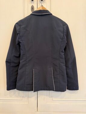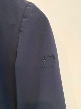 navy lightweight jacket with a tailored, athletic silhouette. Features secure zip pockets and a three-button front for a sleek finish. Breathable, performance-focused fabric for comfortable wear during rides or casual outings. Navy color offers versatile, refined style.