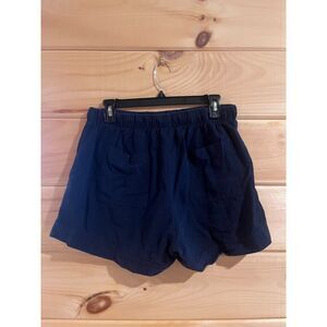 Navy linen high waisted shorts with elastic band. No tags, but I believe it was a size L. Exact measurements are below, but keep in mind that these are very stretchy.