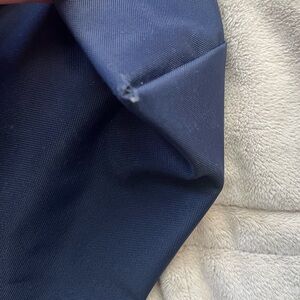timeless le pliage tote bag in navy with brown leather straps. perfect for work, class, or a weekend get away. design, perfect for any occasion. Durable material. Good condition but has small hole in corner and slight pilling on brown leather straps