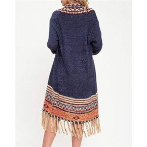 Navy Multi Aztec Tribal Print Fringe Knit Long Cardigan Duster Kimono Sweater