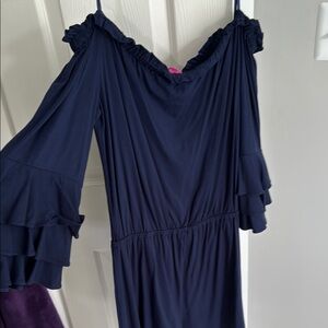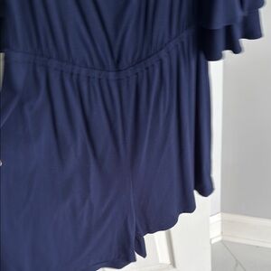 Stylish navy off-shoulder romper with ruffle details. Perfect for casual outings.