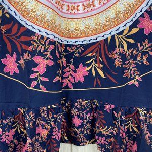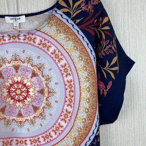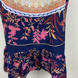 Gorgeous short sleeved medallion and floral print popover tunic length top with ruffled bottom hem. Brand new with tags. Oversized loose fit.