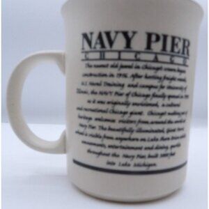 This white ceramic mug features Chicago's Navy Pier in navy blue. 3" diameter, 4⅛" tall