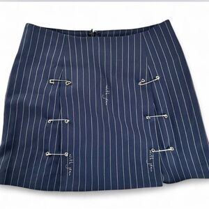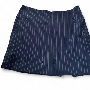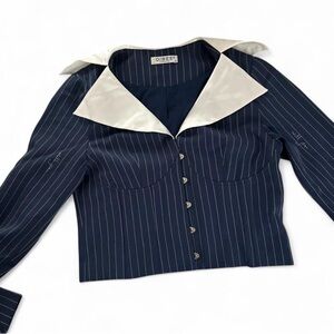 Elegant navy jumpsuit with pinstripes. Features a striking white collar.