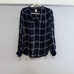 A flowy, lightweight blouse with a deep navy base and white plaid lines for a slightly polished take on the classic button-up. The relaxed silhouette, soft drape, and subtle v-neck keep it feminine, while the single chest pocket adds a casual touch. Works just as well tucked into jeans as it does loosely layered over a tank. Can wear without anything underneath for a subtly sexy look.