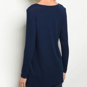 Long sleeve scoop neck white and navy polka dot tunic top. Content: 62% polyester 33% rayon 5% spandex. Made in the USA.