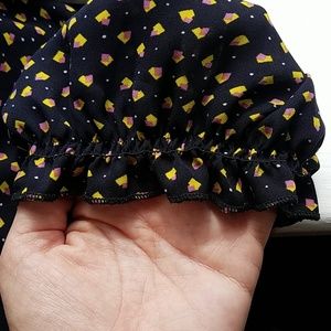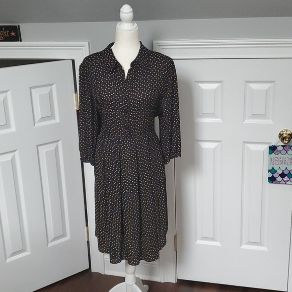 Polyester, elastic waist and 3/4 sleeves. Skirt flares. It is so cute. Always got compliments. One flaw in the buttoned front that can be easily stitched. I showed in 2nd to last pic. I wish it still fit me but is a little too big now. I love this dress!