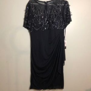 New with tags, beautiful navy blue side ruched shift dress. Embellished with beading for that extra pop! Top is sheer with embellishments, bottom is solid navy blue with side ruching. Sewn in bra cups