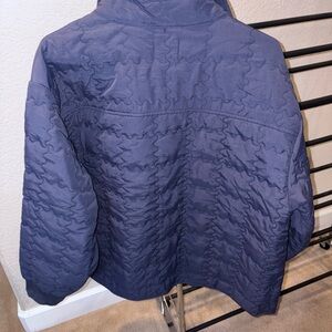 Stylish navy quilted jacket featuring a unique checkered and floral pattern. Perfect for adding a touch of elegance to your wardrobe. Oversized fit, like new!