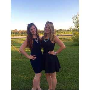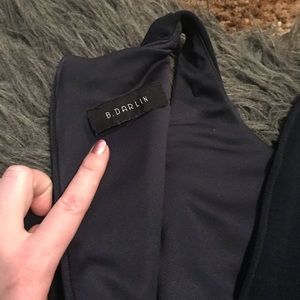 Size “Small” navy blue racerback dress by B. Darlin. This dress was worn once to a wedding & is in perfect condition. Dress is form-fitting & is made for formal/dressy events. Racerback shape makes arms look sleek. As best seen in 3rd pic, dress does have a cross-shaped mold that slims the body in all the right places! Same with the chest area. Make me an offer !