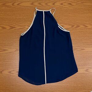 Chic and sporty meets classic! This navy blue sleeveless blouse features a flattering high neckline with contrasting tan trim and a stylish front half-zip detail. The lightweight, flowy fabric drapes beautifully for a relaxed yet polished look.