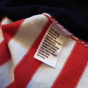 The nautical/patriotic color scheme of navy, with red & white stripes is a unique twist to this holiday shirt.