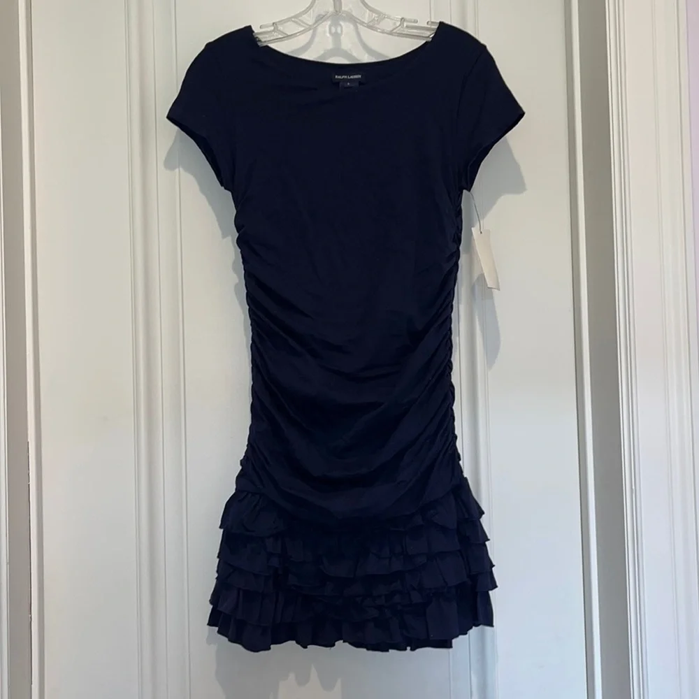 Navy dress with beautiful rouching and ruffled skirt. Perfect for occasions at any time of year!