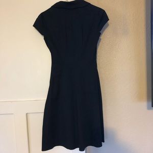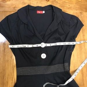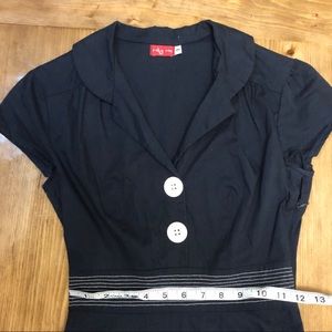 Navy dress with a rockabilly vibe! Is fitted and flares out at the waist. White buttons with anchors and white stitching on front waist. Zipper opening on side