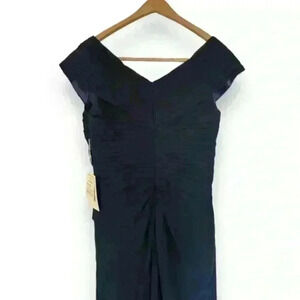 Ada's Bridal Navy Ruched Column Off Shoulder Long Gown Size 16. NWT. Never worn. No flaws. Beautiful dress perfect for a formal event. 100% Polyester. Fully lines. Built in bra with ribbing through top. Hidden zipper on backside.